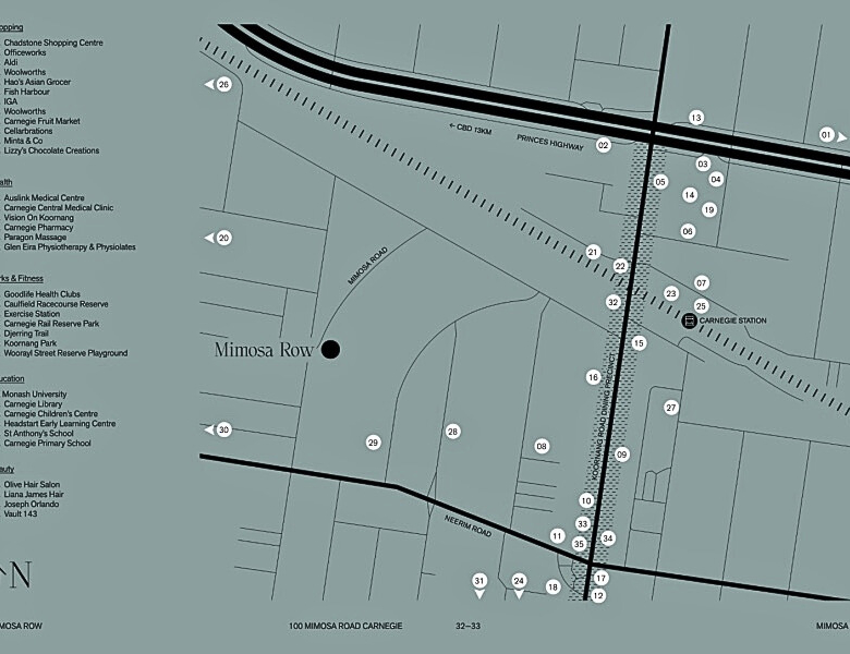 Mimosa Row is ideally positioned in the heart of Carnegie, one of Melbourne’s most vibrant and well-connected suburbs. Surrounded by leafy streets and a warm village atmosphere, residents enjoy direct access to the Koornang Road dining precinct, known for its array of restaurants, cafés, and local bakeries. Everyday conveniences are within walking distance, including Aldi, Woolworths, IGA, and Carnegie Central Shopping Centre.