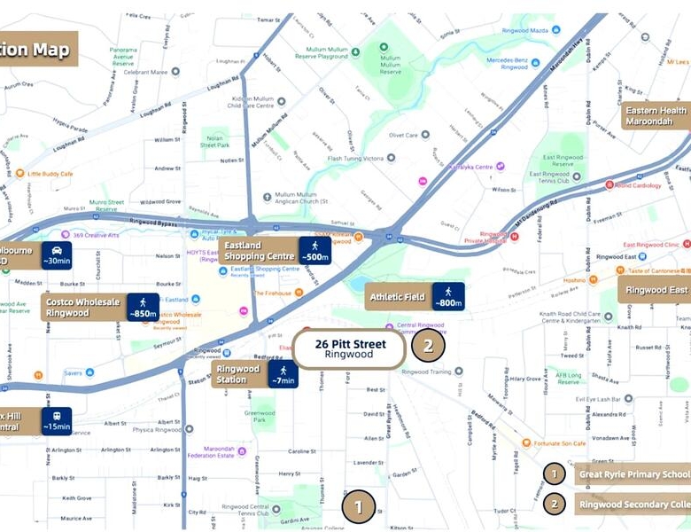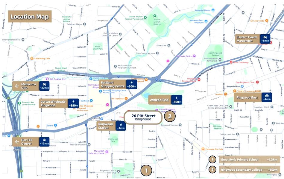 Ringwood is a well-established suburb in Melbourne’s eastern corridor, known for its excellent shopping, transport and lifestyle amenities. The project is located close to Eastland Shopping Centre, one of the major retail hubs in the eastern suburbs, as well as local supermarkets, cafes and restaurants.