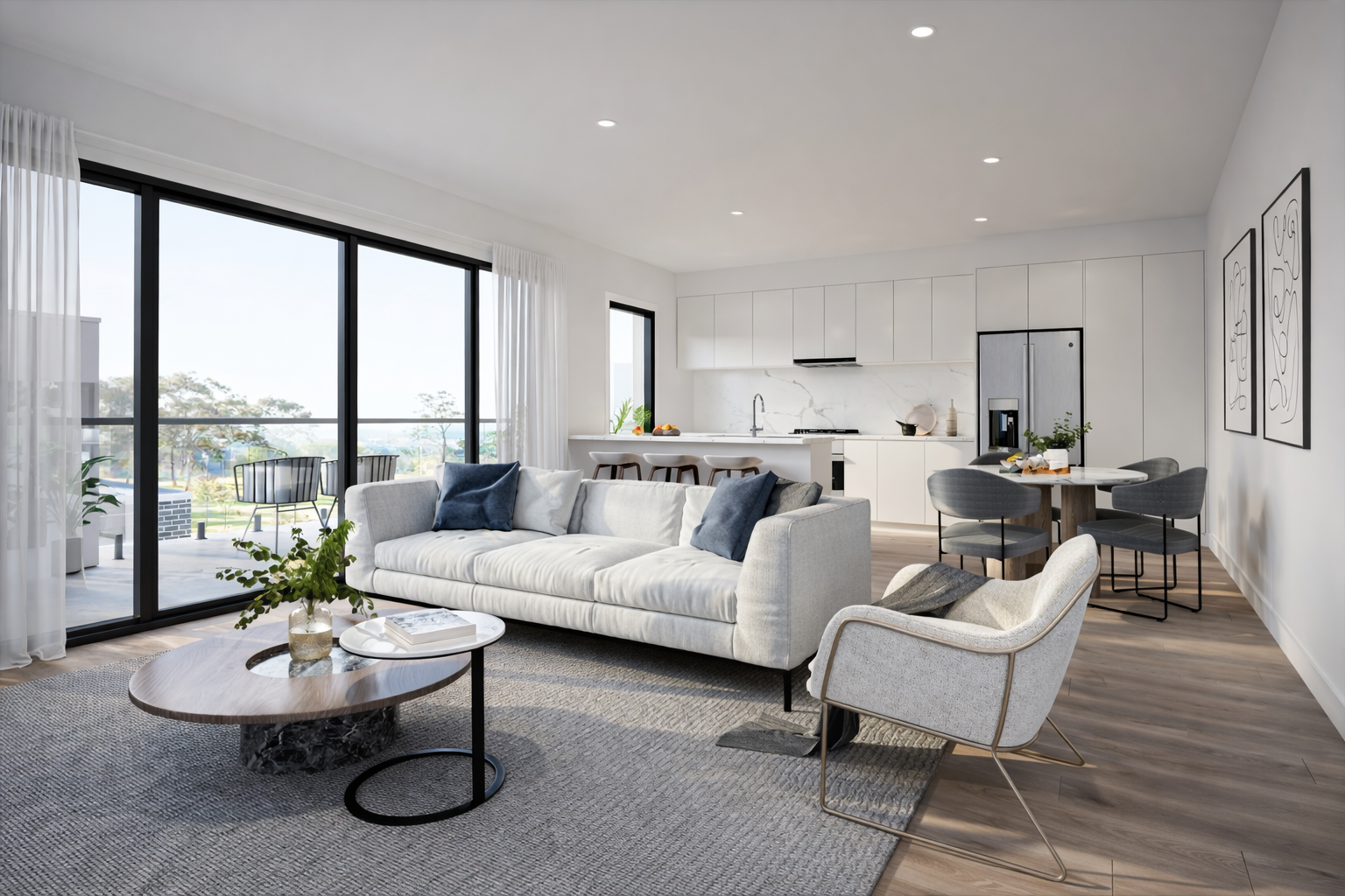 - Open-plan living and dining layouts
