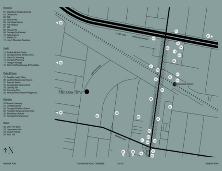 Mimosa Row is ideally positioned in the heart of Carnegie, one of Melbourne’s most vibrant and well-connected suburbs. Surrounded by leafy streets and a warm village atmosphere, residents enjoy direct access to the Koornang Road dining precinct, known for its array of restaurants, cafés, and local bakeries. Everyday conveniences are within walking distance, including Aldi, Woolworths, IGA, and Carnegie Central Shopping Centre.
