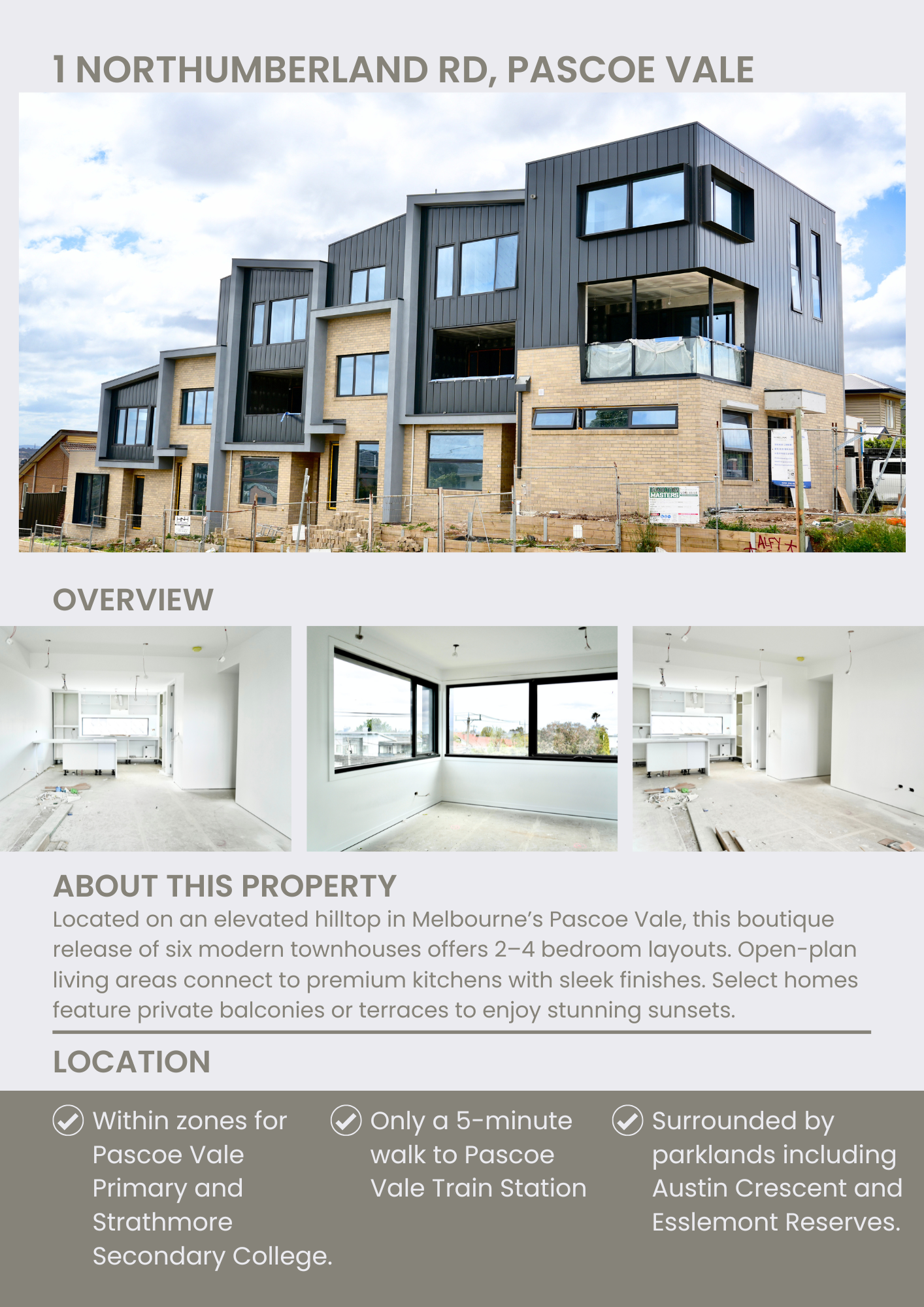 Northumberland Road is a boutique townhouse development located in the established Melbourne suburb of Pascoe Vale. The project comprises a limited collection of six architecturally designed residences offering a mix of 2, 3 and 4 bedroom townhouses. Designed by Wardle Design, the development focuses on contemporary architecture, functional layouts and modern living spaces suitable for families, professionals and investors. These well-planned townhomes feature multi-level layouts, private garages and outdoor spaces, creating a comfortable residential environment in a convenient inner-northern Melbourne location.