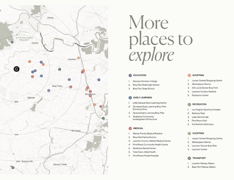Park Lane Joyner is located in a well-established residential area within the City of Moreton Bay, offering convenient access to schools, shopping, transport and healthcare facilities. The project is close to Genesis Christian College, Bray Park State High School and Bray Park State School, making it suitable for families. Shopping and daily needs are easily met with Joyner Central Shopping Centre and Marketplace Warner nearby. Residents also benefit from access to Lawnton Railway Station and Bray Park Railway Station, providing public transport connections to Brisbane. Medical services are available at Pine Rivers Private Hospital and nearby medical centres, while major local roads connect the suburb to Brisbane and surrounding areas. The location offers a balance of quiet suburban living with strong connectivity to employment hubs and city amenities.