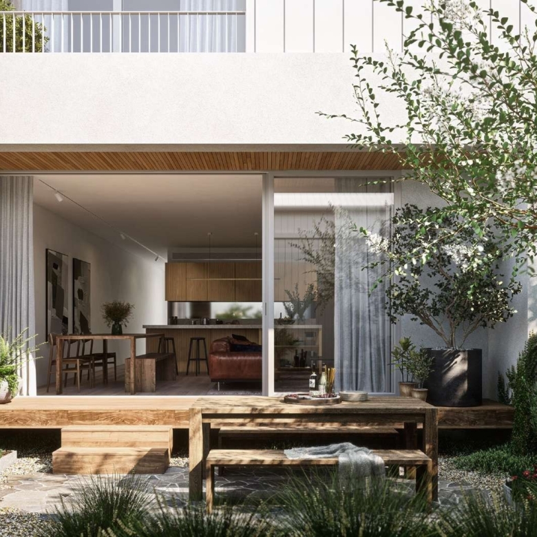 Thoughtful, design-led residences with ground-floor living, private courtyards, landscaped outdoor spaces, and secure car parking.