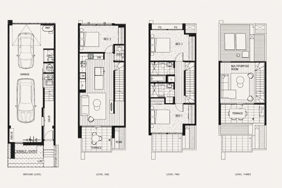 Thoughtfully designed multi-level residences offering generous internal spaces.